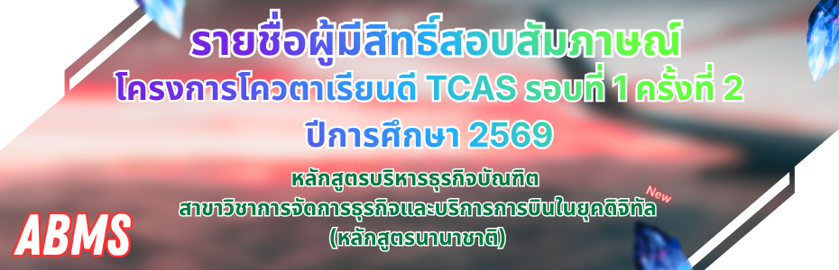 ประกาศรายชื่อผู้มีสิทธิ์สอบสัมภาษณ์ โครงการรับนักศึกษาโควตาเรียนดี TCAS รอบที่ 1 ครั้งที่ 2 ปีการศึกษา 2569 สาขาวิชาการจัดการธุรกิจและบริการการบินในยุคดิจิทัล (หลักสูตรนานาชาติ) วิทยาลัยนานาชาติ