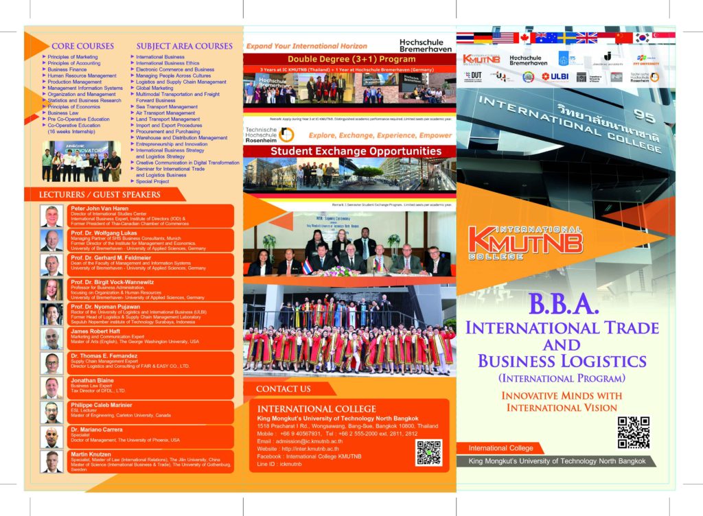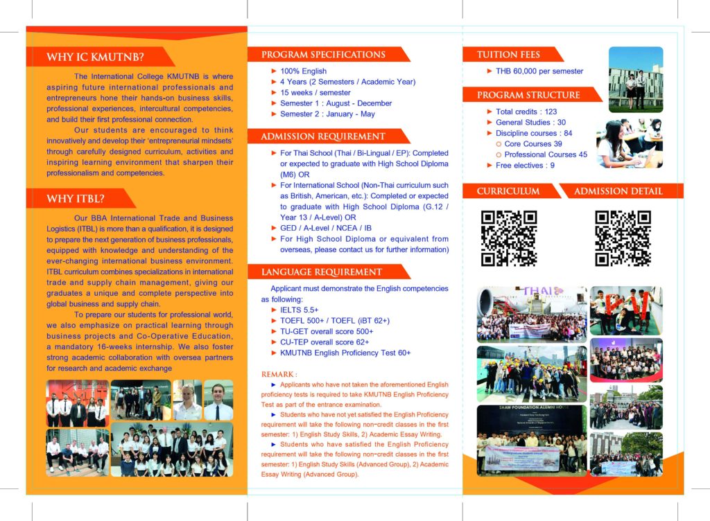 - Students who have not taken TOEFL or equivalent test must take the KMUTNB English Proficiency Test as part of the entrance examination and demonstrate the required level of English Proficiency skill during the first year of the program at International College.
